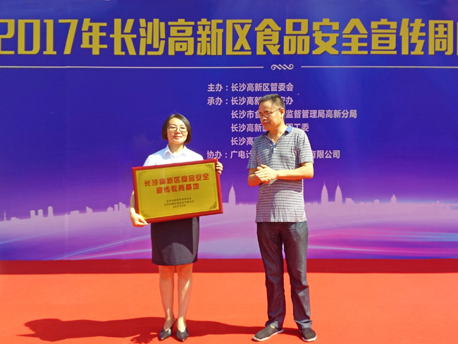 在啟動儀式上,長沙高新區(qū)食安辦副主任連正奇向廣電計量授牌“長沙高新區(qū)食品安全宣傳教育基地”,基地落戶廣電計量大廈。