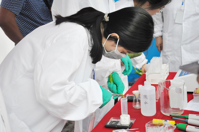 當天的活動現(xiàn)場設(shè)置企業(yè)展示、食品快速檢測服務體驗、食藥真假辨別、長沙創(chuàng)建全國食品安全示范城市成果展覽四大專區(qū)。其中,食品快速檢測服務體驗區(qū)由廣電計量現(xiàn)場配備快檢設(shè)備和專業(yè)技術(shù)人員,為當?shù)鼐用裉峁┦卟恕⑷狻⑺热粘J称返默F(xiàn)場快檢服務,以專業(yè)技術(shù)和數(shù)據(jù)幫助公眾擊破各類食品謠言,樹立正確的食品認知。聽說只需十幾分鐘就可以知道食物否含有農(nóng)藥殘留、瘦肉精等有害物質(zhì),市民們紛紛拎著自家剛買的肉蔬品排隊等待檢測。