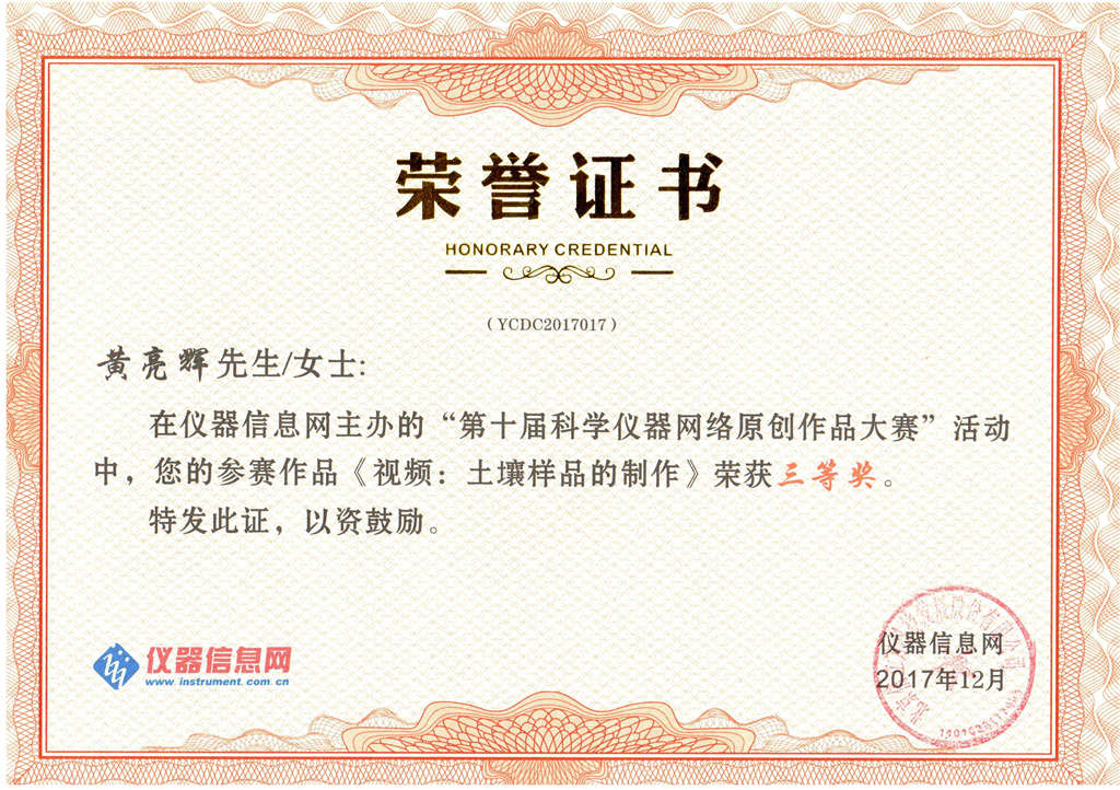 此外,廣電計量環保檢測技術工程師黃亮輝憑借原創視頻《土壤樣品制備》,在763篇作品中脫穎而出,榮獲科學儀器年度網絡原創作品大賽三等獎。作品用清晰專業的視頻視角解讀了工作量巨大、實際操作困難的土壤樣品制備過程,其完整的內容、專業的講解為行業人員提供了較高的參考價值。