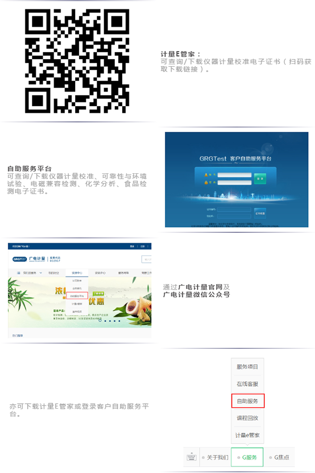 即日起廣電計量為客戶免費提供標準版的儀器設備管理軟件“計量E管家”,同時為客戶提供自助服務平臺(http://120.197.59.40:8086)、公司官網(www.xiangdaal.com.cn)、微信公眾號等多種電子證書查詢、下載渠道。