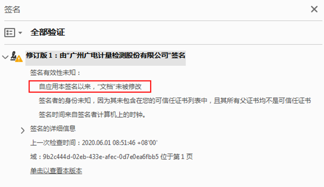 推薦您采用Adobe Reader打開電子證書pdf文件,展開簽名面板,即可查看證書蓋章的單位及說明。