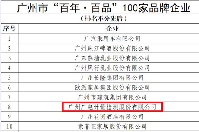 7月6日,廣州市質(zhì)量強市工作領(lǐng)導(dǎo)小組辦公室發(fā)布廣州市“百年·百品”企業(yè)名單,廣電計量憑借出色的綜合實力和良好的企業(yè)責任擔當,在近400家廣州本土品牌企業(yè)的角逐中脫穎而出,成功入選百強企業(yè)名單。