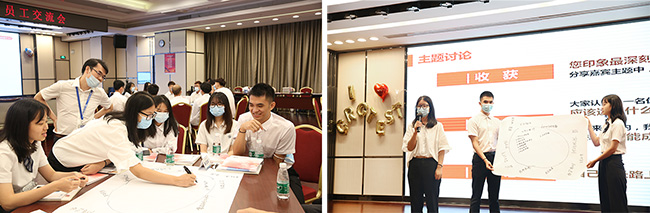 儀式結束后,公司安排多位應屆生身份入職,實踐經驗豐富的“老”員工與各位“新生力”進行面對面交流。“老”員工們分享自己在公司成長中的點點滴滴,傳授自己的工作經驗,幫助“新生力”答疑解惑。“新生力”們也紛紛向前輩取經學習,積極提問,一同討論。