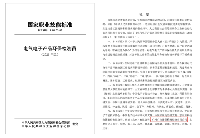 11月25日,由人力資源社會保障部、工業和信息化部共同制定的國家職業技能標準《電氣電子產品環保檢測員國家職業技能標準(2021年版)》(以下簡稱《標準》)正式發布。作為《標準》主要審定單位之一,廣電計量參與了該新職業技能標準的審定工作,積極服務新職業人才建設,助力綠色制造轉型升級。