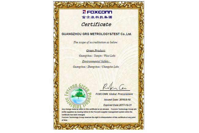 日前,廣電計量成功通過富士康科技集團的評審, 成為其2016-2017年度推薦認可的第三方檢測機構,可為富士康及其供應商提供專業、高品質的第三方綠色環保檢測服務,包括產品環保檢測和環境安全檢測,認可范圍覆蓋廣州、天津、無錫等多個檢測基地實驗室。