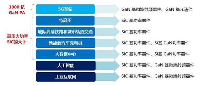 第三代半導(dǎo)體在新基建七大領(lǐng)域都有其廣泛的應(yīng)用前景。在5G基站領(lǐng)域, GaN PA(即氮化鎵功率放大器)是5G基站的最優(yōu)選擇,預(yù)計(jì)在2025年前,我國(guó) 5G 宏基站預(yù)計(jì)將建設(shè)超過(guò)500萬(wàn)站,而5G宏基站、微基站、及毫米波基站帶來(lái)的GaN PA 市場(chǎng)規(guī)模將超過(guò)1000億元,而特高壓、高鐵和軌交、充電樁、大數(shù)據(jù)中心等高壓大功率領(lǐng)域都將是SiC的天下。