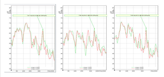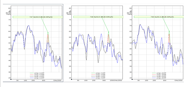 進一步分析NTF(力聲傳遞函數)可以看出空調管路三個方向的NTF在特征頻帶都有較高的峰值,如下圖: