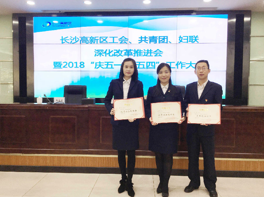 湖南子公司向勇(右)、劉麗娜(中)、張琴(左)分別獲長沙高新區工會“青年崗位能手”、“優秀工會工作者”、“優秀婦女工作者”稱號