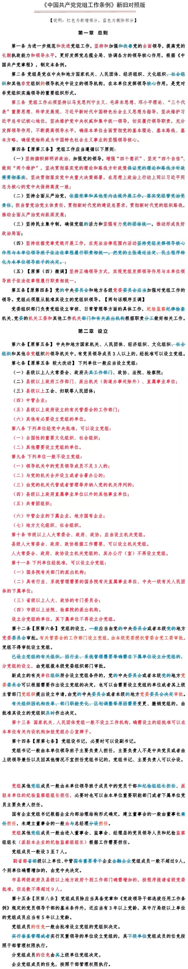 通知指出,2015年6月中共中央印發(fā)的《中國(guó)共產(chǎn)黨黨組工作條例(試行)》,對(duì)推進(jìn)黨組工作制度化、規(guī)范化、程序化發(fā)揮了重要作用。黨的十九大黨章修正案對(duì)黨組職責(zé)作了充實(shí),進(jìn)一步明確了黨組管黨治黨的政治責(zé)任。黨中央根據(jù)新的形勢(shì)、任務(wù)和要求,對(duì)條例予以修訂完善。