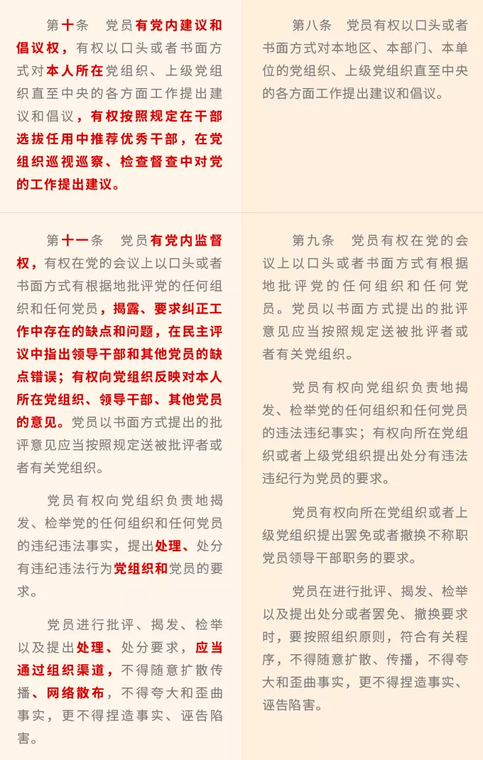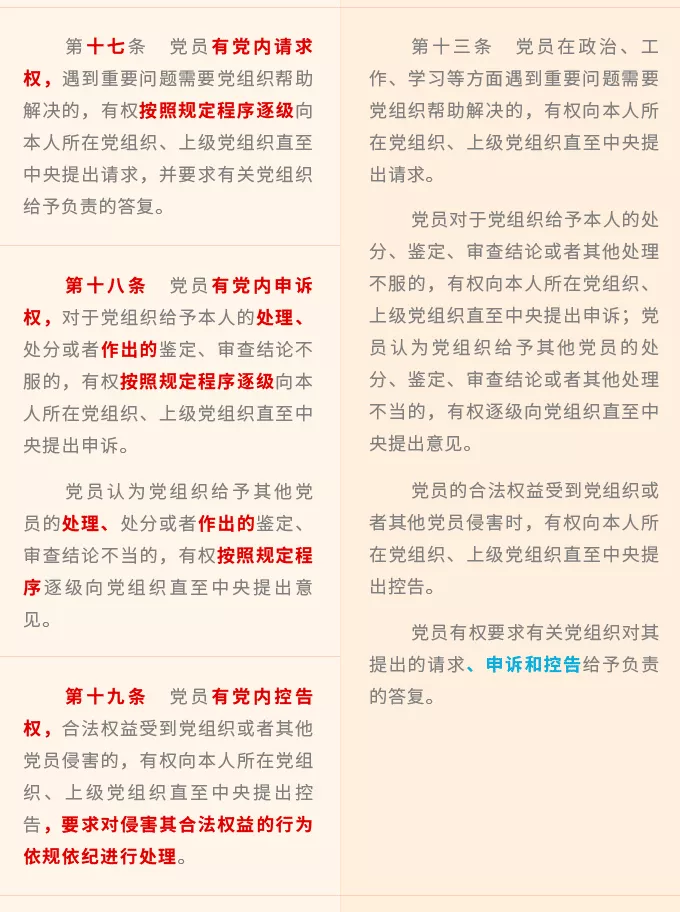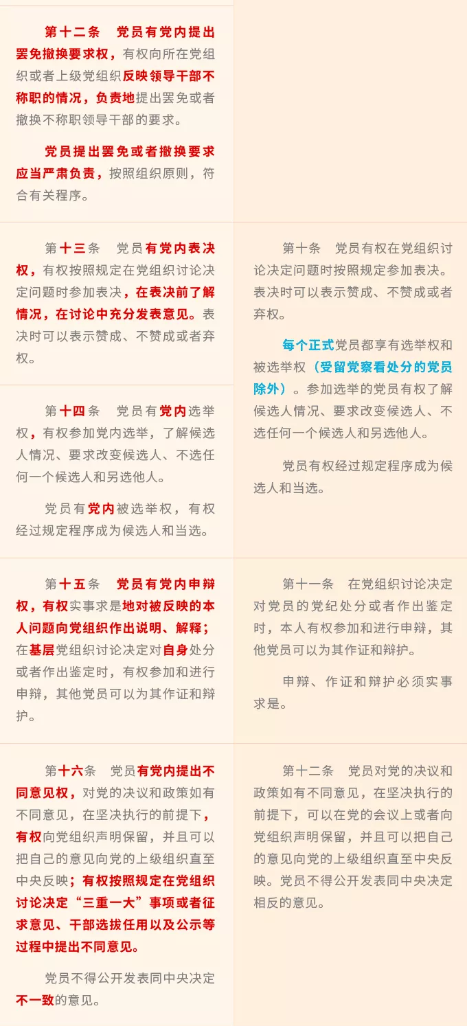 新修訂《條例》修改了2004年《條例》分別用一個(gè)條文對(duì)應(yīng)黨章第四條規(guī)定的一個(gè)方面權(quán)利的體例安排,將黨章規(guī)定的8個(gè)方面黨員權(quán)利進(jìn)一步細(xì)化,規(guī)定黨員享有黨內(nèi)知情權(quán)、接受黨的教育培訓(xùn)權(quán)、黨內(nèi)參加討論權(quán)、黨內(nèi)建議和倡議權(quán)、黨內(nèi)監(jiān)督權(quán)、黨內(nèi)提出罷免撤換要求權(quán)、黨內(nèi)表決權(quán)、黨內(nèi)選舉權(quán)和被選舉權(quán)、黨內(nèi)申辯權(quán)、黨內(nèi)提出不同意見(jiàn)權(quán)、黨內(nèi)請(qǐng)求權(quán)、黨內(nèi)申訴權(quán)、黨內(nèi)控告權(quán)等13項(xiàng)權(quán)利。
