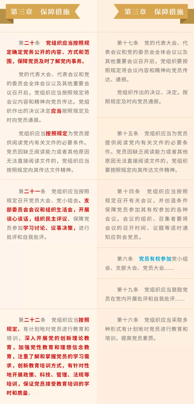新修訂《條例》貫徹“堅(jiān)持充分全面保障黨員權(quán)利”的原則,設(shè)立“保障措施”專(zhuān)章,系統(tǒng)規(guī)定了20項(xiàng)保障措施,在保障黨員權(quán)利方面更加充分全面、有力有效。
