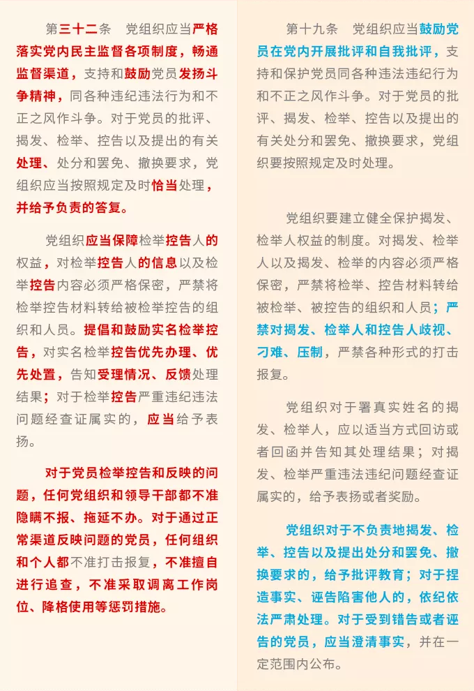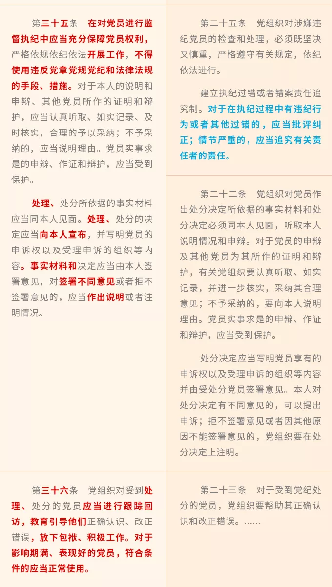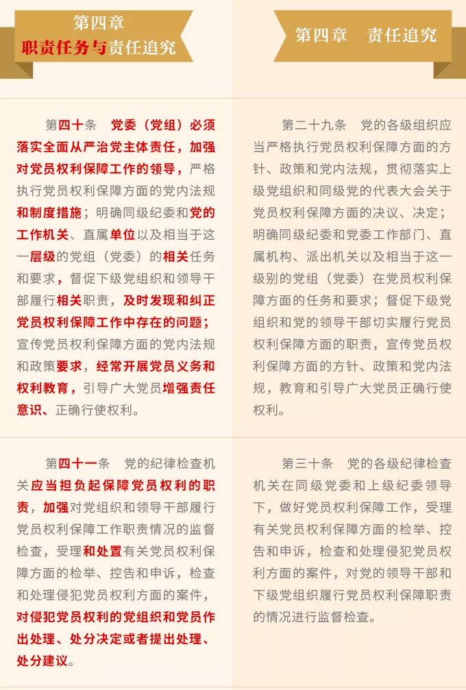 進(jìn)一步明確了黨的紀(jì)律檢查機(jī)關(guān)在保障黨員權(quán)利方面的職責(zé),將保障黨員權(quán)利貫穿監(jiān)督執(zhí)紀(jì)工作全過(guò)程,規(guī)定紀(jì)律檢查機(jī)關(guān)要加強(qiáng)監(jiān)督檢查,受理和處置黨員權(quán)利保障方面的檢舉、控告和申訴,對(duì)侵犯黨員權(quán)利的案件進(jìn)行檢查和處理。