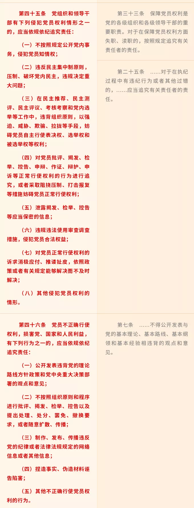 新修訂《條例》將嚴(yán)明紀(jì)律規(guī)矩的精神貫穿全篇,在第三章“保障措施”中針對(duì)黨組織和領(lǐng)導(dǎo)干部強(qiáng)調(diào)了相關(guān)紀(jì)律要求,特別是在第四章“職責(zé)任務(wù)和責(zé)任追究”中詳細(xì)列明了黨組織和領(lǐng)導(dǎo)干部侵犯黨員權(quán)利的8類(lèi)具體情形,如不按照規(guī)定公開(kāi)黨內(nèi)事務(wù),侵犯黨員知情權(quán);泄露揭發(fā)、檢舉、控告等應(yīng)當(dāng)保密的信息等等。