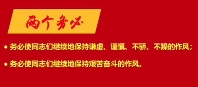 習(xí)近平總書記強(qiáng)調(diào):“對(duì)毛澤東同志提出‘兩個(gè)務(wù)必’的深邃思想和戰(zhàn)略考慮,我們要不斷學(xué)習(xí)領(lǐng)會(huì)。我們要不斷向全黨嚴(yán)肅鄭重地提出這個(gè)問(wèn)題,始終做到謙虛謹(jǐn)慎、艱苦奮斗,使我們的黨永遠(yuǎn)不變質(zhì)、我們的紅色江山永遠(yuǎn)不變色。”牢記是為了更好出發(fā)。只有始終牢記全心全意為人民服務(wù)的宗旨,才能始終同人民風(fēng)雨同舟、領(lǐng)航中國(guó)號(hào)巨輪破浪前行;只有保持謙虛、謹(jǐn)慎、不驕、不躁的作風(fēng),只有保持艱苦奮斗的作風(fēng),才能始終同人民密切聯(lián)系在一起,在這場(chǎng)歷史性考試中經(jīng)受考驗(yàn),不斷向歷史、向人民交出新的更加優(yōu)異的答卷。