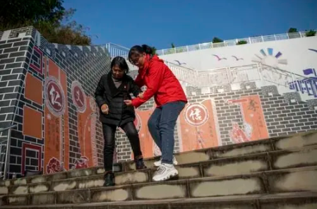 一名老師攙扶張桂梅(左)下臺階(2020年11月30日攝)