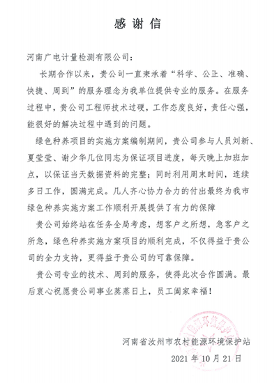 在汝州項目保障期間,時間緊,任務重,天氣突變,而劉新前一天晚上堅持工作到凌晨3點,第二天清早又趕到客戶辦公室,最終體力不支病倒了,團隊的同事們紛紛送上關(guān)切的問候,讓她回去休息,但劉新仍然堅持留在工作現(xiàn)場做好技術(shù)指導與工作協(xié)調(diào),她的拼勁為團隊注入強大的精神動力,大家一起堅守趕制完成報告,團隊又連夜從汝州趕回鄭州,陪同客戶如期將報告提交到政府主管部門。最終,試點實施方案順利通過,廣電計量的綜合能力獲得認可,并收到了客戶表揚信。