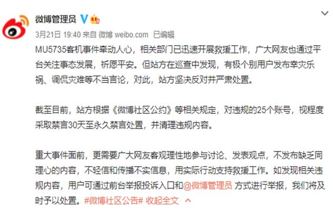 微博處置25個調侃墜機災難賬號