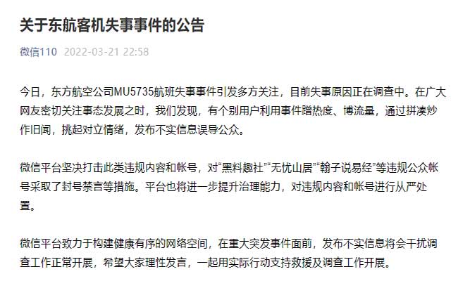 “微信110”公眾號21日發布公告:有個別用戶利用事件蹭熱度、博流量,通過拼湊炒作舊聞,挑起對立情緒,發布不實信息誤導公眾。微信平臺堅決打擊此類違規內容和帳號,對“黑料趣社”“無憂山居”“翰子說易經”等違規公眾帳號采取了封號禁言等措施。平臺也將進一步提升治理能力,對違規內容和帳號進行從嚴處置。