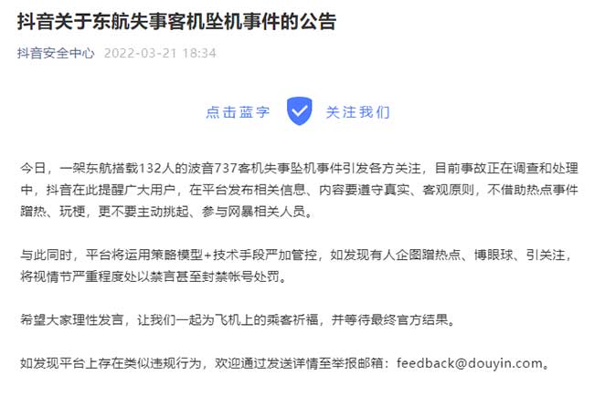 ”抖音安全中心“微信公眾號21日發布公告:一架東航搭載132人的波音737客機失事墜機事件引發各方關注,目前事故正在調查和處理中,抖音在此提醒廣大用戶,在平臺發布相關信息、內容要遵守真實、客觀原則,不借助熱點事件蹭熱、玩梗,更不要主動挑起、參與網暴相關人員。與此同時,平臺將運用策略模型+技術手段嚴加管控,如發現有人企圖蹭熱點、博眼球、引關注,將視情節嚴重程度處以禁言甚至封禁帳號處罰。