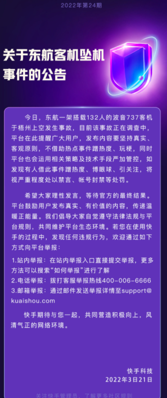 快手科技21日發布公告:發布內容要堅持真實、客觀原則,不借助熱點事件蹭熱度、玩梗,同時平臺也會運用相關策略及技術手段嚴加管控,如發現有人借此事件蹭熱度、博眼球、引關注,將視嚴重程度處以禁言、帳號封禁等處罰。